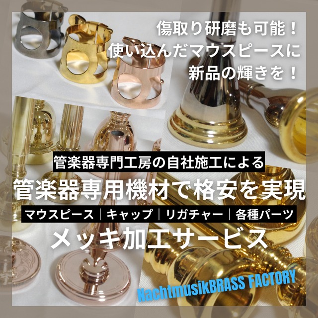 当方のメッキ加工は、トランペットで有名なシルキー氏の「素材による音響への影響」の科学的実証実験により、「メッキ」による音響への影響は無かったという実験結果を推し、音響への影響を目的としておりません。 マウスピースへのメッキ加工は、内側にも施すことにより、「音響」への影響は無くても、「吹奏感」を含むコンディションへの影響はあるものと考えております。 口あたりを滑らかにするなどの効果は期待できるものと考えています。 このような考えのもと、当方のメッキ加工は「薄く」施します。 また、加工前に傷取りと、超音波洗浄+電解脱脂処理を行いクリーニングした上、加工します。 ネットでは格安メッキ業者がありますが、管楽器に特化し、加工前処理も本格的に行う業者は少ないと思います。 メッキ前処理OPTION 【無料簡易磨き】 研磨剤による磨き作業 白曇りの原因となる微細な傷は除去可能ですが、目に見える傷はメッキ後もそのまま残ります。 目に見えない薄い傷で白っぽくなっているものは輝きを取り戻します。磨きは外側のみです。 ★新品や新品同様品向け 【傷取り研磨】・・・1,500円 機材によるバフ研磨 目に見える傷や腐食・変色などがある場合、こちらをお選びください。元のメッキは残します。研磨は外側のみです。 ★若干の使用感のあるもの向け 【傷取り研磨+インナークリーニング】・・・3,500円 機材によるバフ研磨+細部用バフでインナー部表面も研磨 リム、インナー部分に汚れ・錆などの付着がある場合はこちらをお選びください。 ★ある程度の使用感のあるもの向け 【メッキ剥離研磨】・・・6,500円 機材によるバフ研磨(長時間) 既にメッキハゲがある場合、新たにメッキがすると色ムラになる可能性があります。元のメッキ剥離後にメッキすることでムラを防ぎます。 ★メッキハゲまたは黒ずみのあるマウスピース向け 【ラッカー剥離研磨】・・・13,500円 キャップ類は、ラッカーが塗布されている場合があります。ラッカーの上からはメッキはかけられませんので、剥離研磨が必要になります。 ご不明な場合は、当方で確認の後、追加で選択可能です。 【ご注意】 ・各研磨でも取り切れない傷が残る場合もございます。 ・メッキ剥離研磨は、状態により0.01mm単位で形状が変化する場合がございます。 ・キャップ類は内側には加工出来ません。 ・インナー部は薄くなる場合がございます。