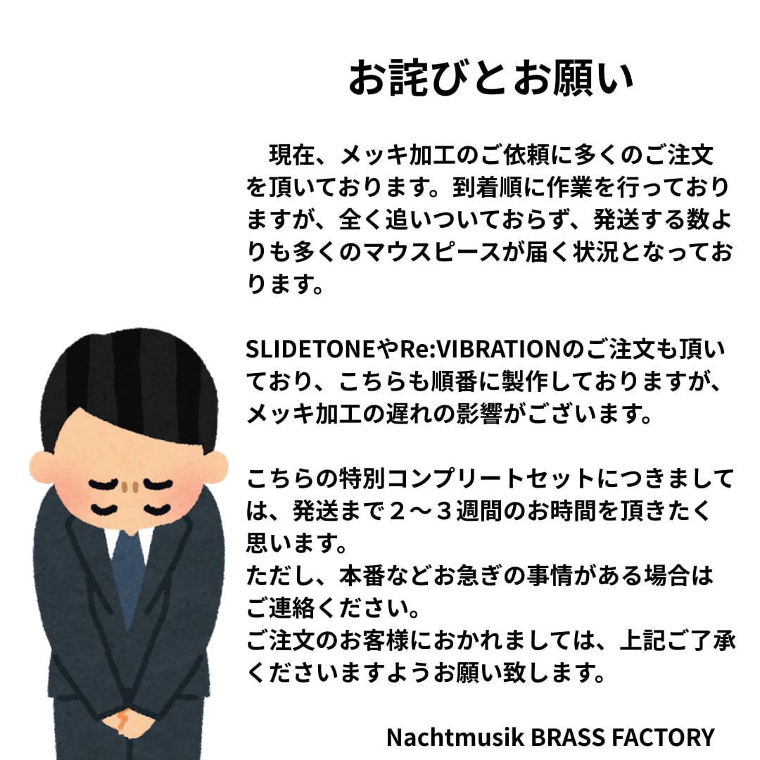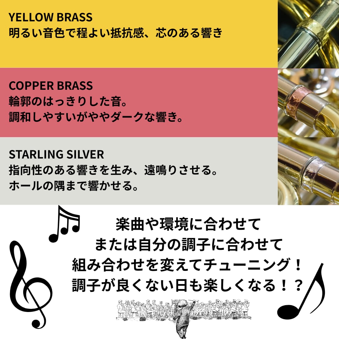 トロンボーン、ユーフォニアム、チューバの方は、取り付け予定の管(主に主管。トロンボーンの場合、主管入口側か出口側かでサイズが異なりますので、ご注意ください。)のサイズ径をご購入時に備考欄にご記入くださいますようお願いいたします。